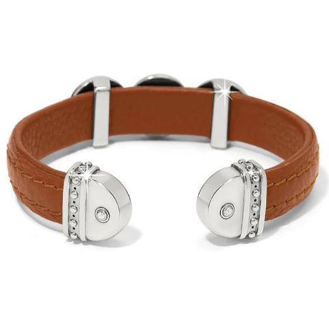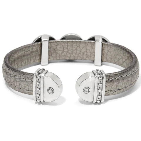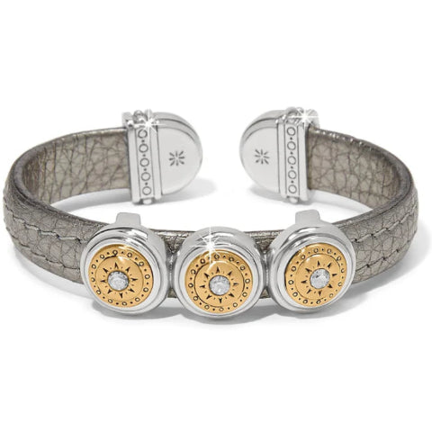 This leather wrapped bendable cuff bracelet has a design matching the Mosaic Collection with 3 discs with inlaid brushed gold pieces, with center silver shade crystals.