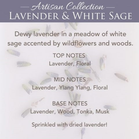 FRAGRANCE: Dewy lavender in a meadow of white sage accented by wildflowers and soft woods. Top Notes: Lavender, Floral Mid Notes: Lavender, Ylang Ylang, Floral Base Notes: Lavender, Wood, Tonka, Musk
