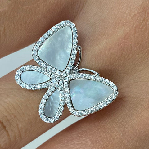Flutter into spring with our Pave Mother of Pearl Butterfly Ring! This stunning piece adds a touch of whimsy to any outfit. Embrace the season of renewal with this charming ring.
