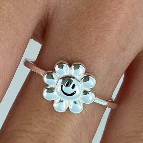 Spread happiness wherever you go with our Smiley Flower Ring. This playful and quirky accessory is guaranteed to put a smile on your face (and others too!). With its happy design, this ring is sure to brighten up any outfit and your day.